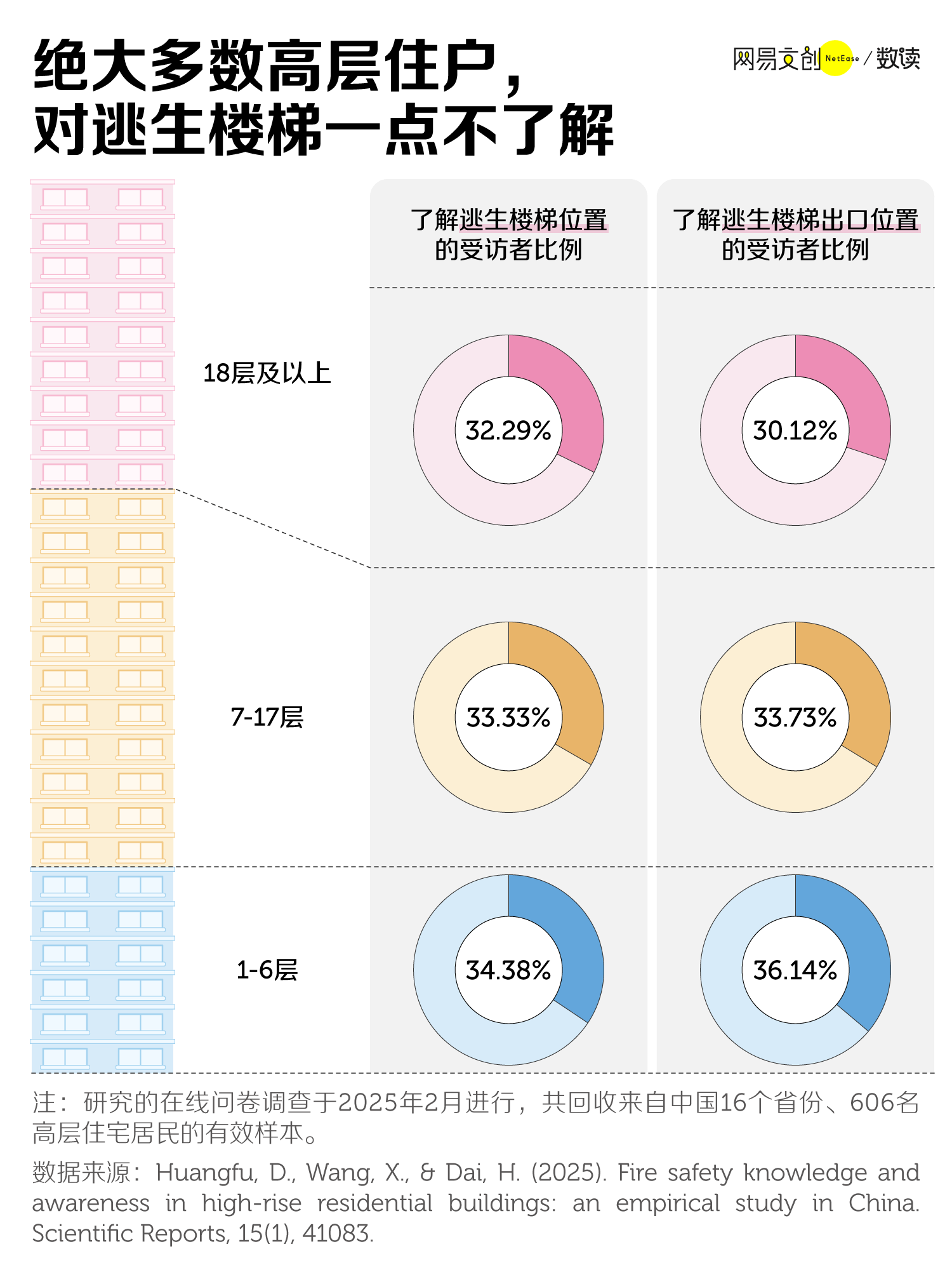 人们对逃生方向的陌生,更让获救难上加难。2025年发表在 Nature 子刊《科学报告》的一项研究显示,仅三成高层住宅居民清楚逃生楼梯的位置,而且住得越高,人们对逃生楼梯就越缺乏了解。