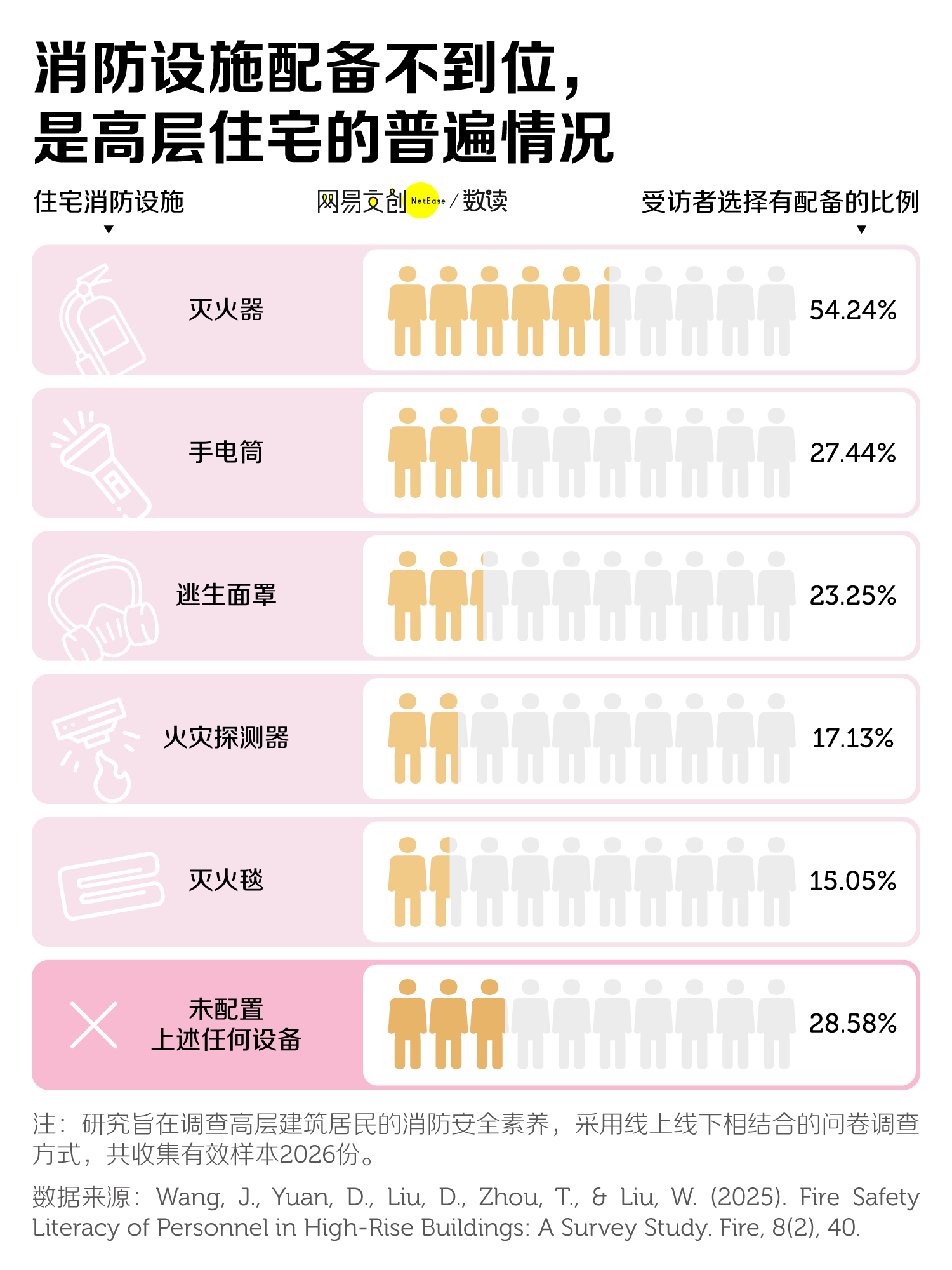 消防设施“缺斤少两”,也是常态。另一项针对中国高层建筑居民消防安全素养的研究,调研发现有28.6% 的住宅甚至没配备任何消防设施。