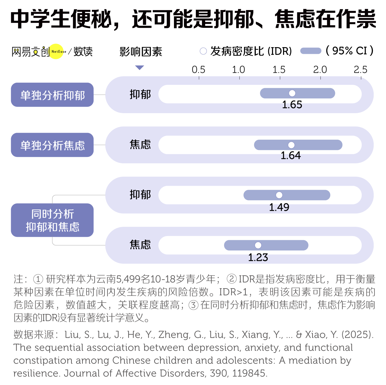 发表在《情感障碍杂志》的一项研究指出,存在抑郁症和焦虑症的学生,患上便秘的风险分别是普通学生的1.65倍和1.64倍 [8]。