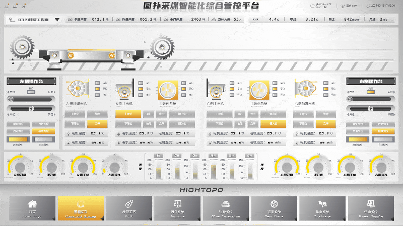 底端动态展示左、右区刀盘、主轴及左区摇臂等设备的运行参数,通过可视化交互界面为作业人员提供全流程设备运行态势感知,实现智能化、精细化的煤炭开采作业管控。