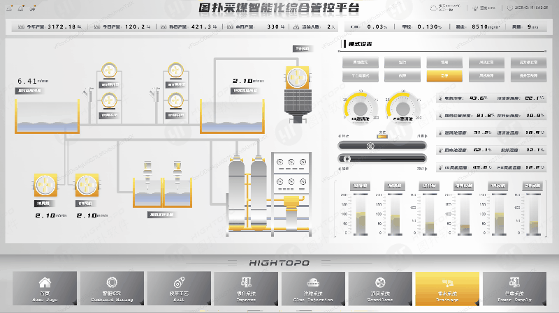 HT采用Low-Code大屏组态技术,以直观、集成、动态的方式,呈现井下采掘、通风、运输、瓦斯监测、排水、供电等关键系统的工艺流程与实时数据。将复杂的井下生产工况转化为易于理解的可视化画面,为管理人员提供掌控生产态势的“全景窗口”。