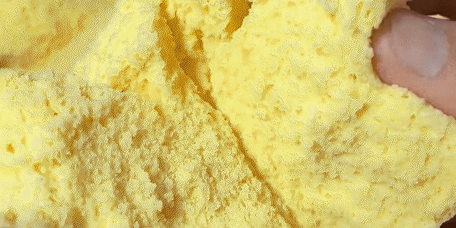 面粉打法均匀后,倒入65克纯牛奶,再继续告诉打发均匀,直到提起有这种黏稠的纹路状态即可。