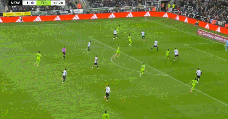 第90+2分钟,托纳利角球开出,米利头球破门,纽卡2-1富勒姆