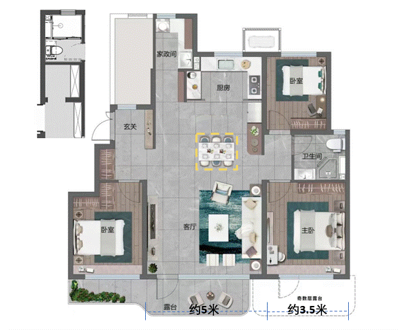 客厅开间约5米,主卧开间约3.5米,尺度适中,没有追求过度加宽尺寸浪费面积,也足够每个卧室都预留出收纳空间。