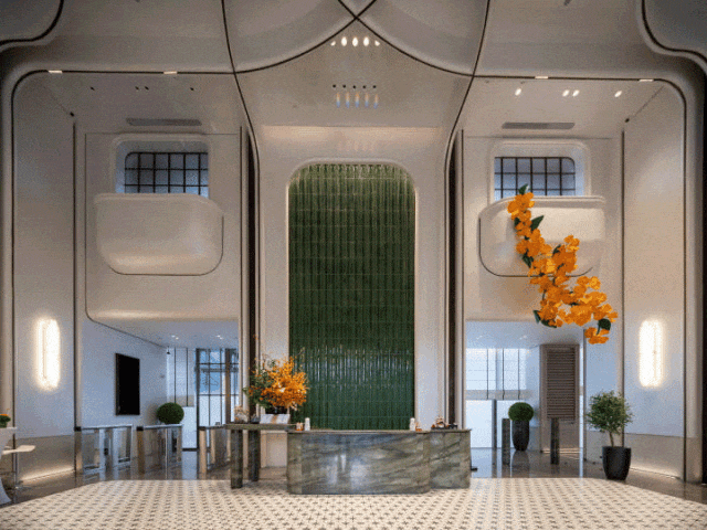 酒店式入户大堂,随处可见的广雕、广绣、满洲窗、花砖、岭南花艺等在地元素。