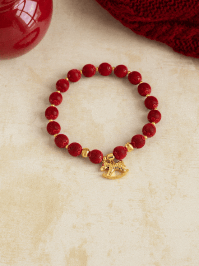 纯正饱满的朱砂红,搭配金色隔珠点缀,两颗闪闪的猫眼转运珠,代表着时来运转。