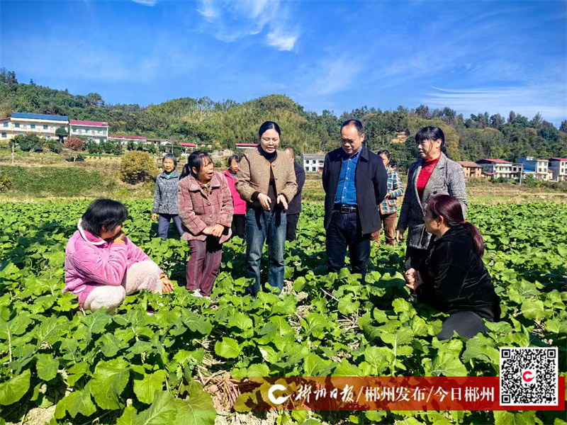 2024年11月29日,安仁县科技特派员、农艺师李玲玲在灵官镇莽山村与村民现场交流油菜栽培技术。