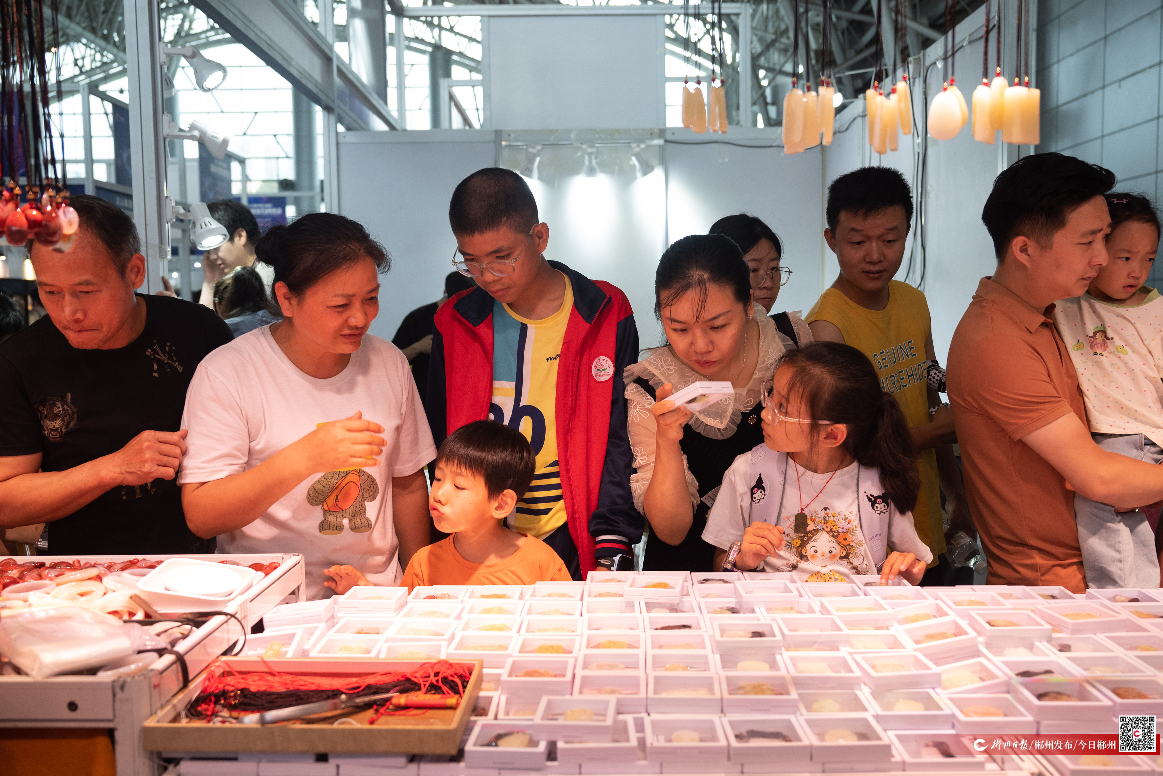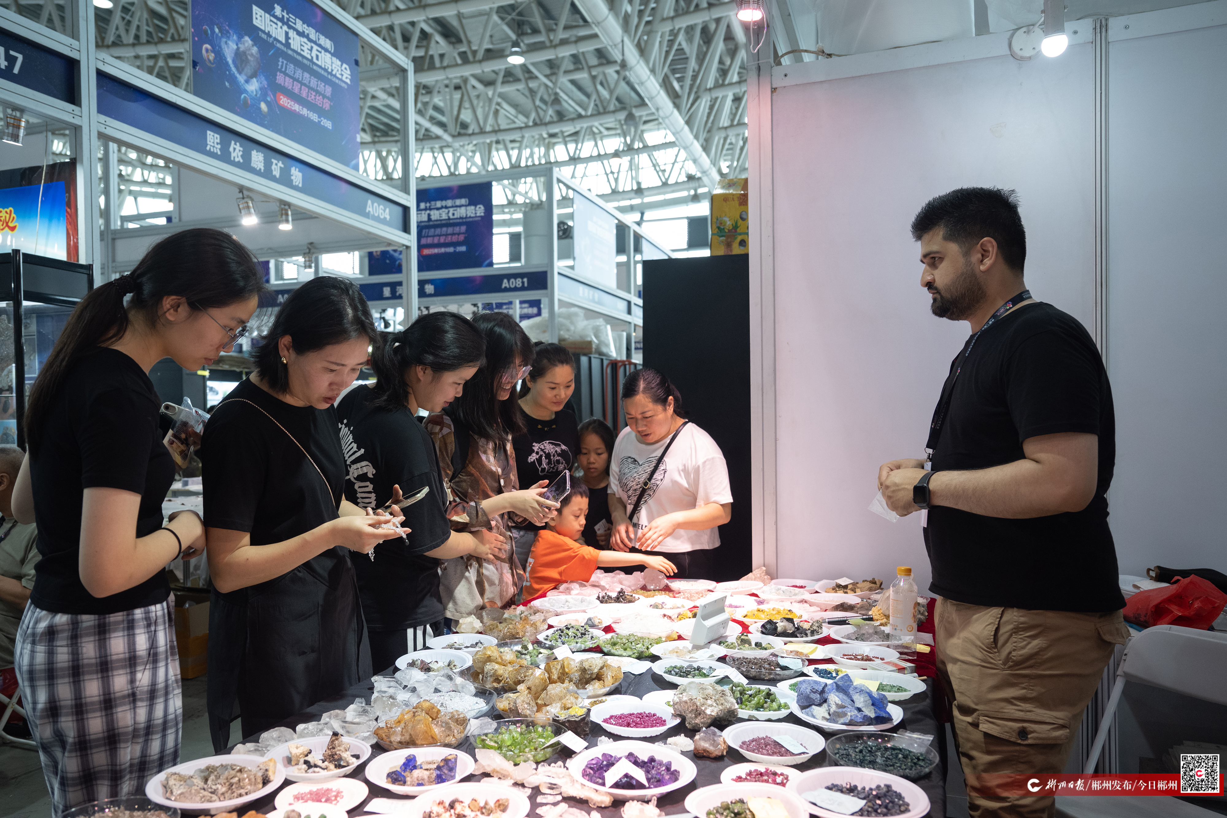 5月18日,在第十三届中国(湖南)国际矿物宝石博览会现场,前来参观和购买宝石的人员络绎不绝。本届展会为期5天,有月球陨石NWA、巴西URUACU铁陨石“天官下凡”、阿根廷艾斯克尔橄榄陨石“宇宙瑰宝”等在内的万余件珍稀标本集中亮相,吸引了众多国内外游客前来参观和购买。