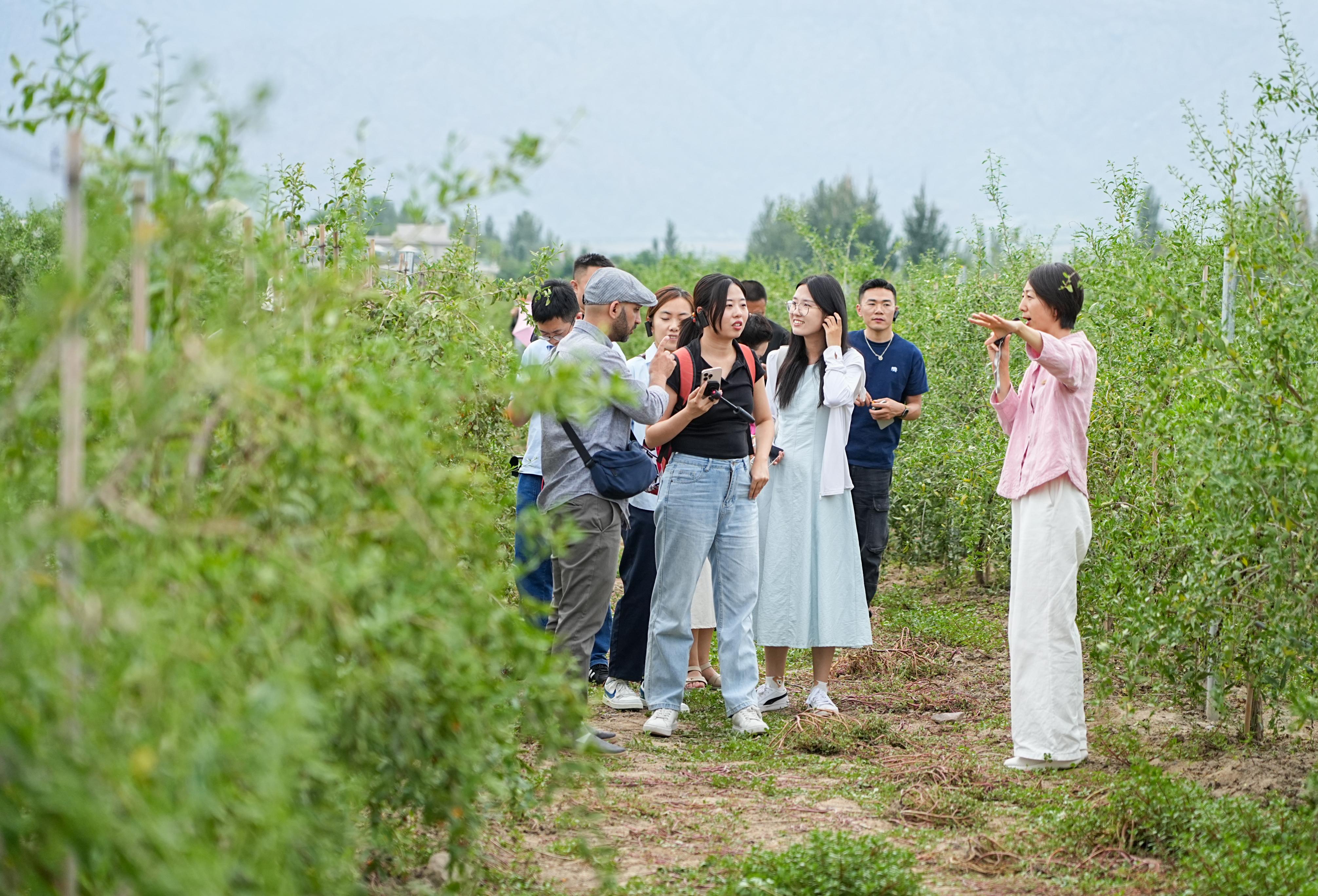 在种植基地,成员们随机采下一颗枸杞,“甜”成为共识。宁夏枸杞色艳、粒大、皮薄、肉厚、质柔、味甘,营养丰富、食用和药用价值极高,枸杞中富含的枸杞多糖、叶黄素等微量元素,有助于提高人体免疫力。