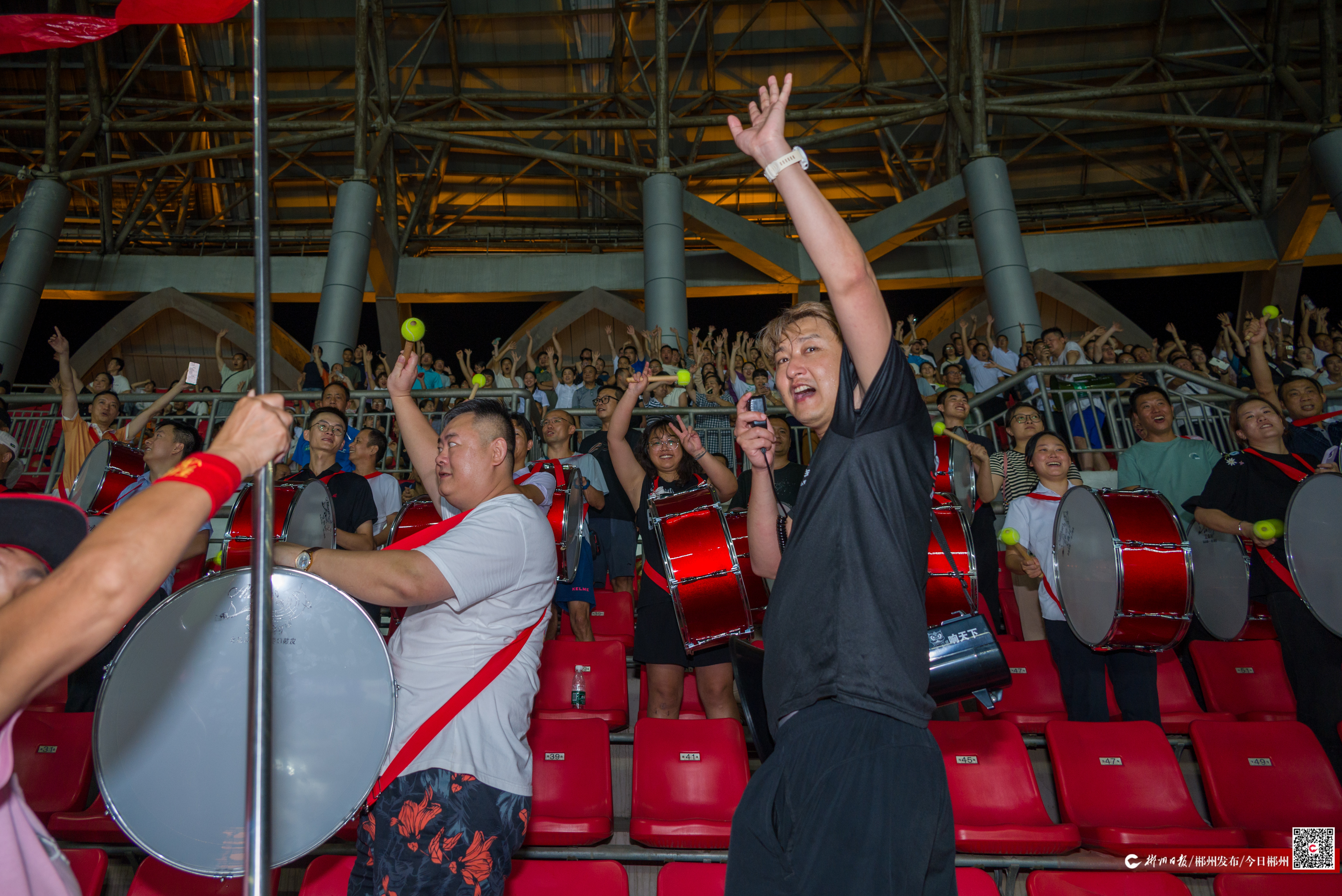 “我们的球队是:郴州!郴州!郴州!我们的目标是:必胜!必胜!必胜!”9月9日晚,郴州市体育中心灯火如昼,“湘超”联赛郴州队助威团进行第一次彩排,500余名来自各行各业的郴州队助威团成员集结,以震耳欲聋的口号划破夜空。