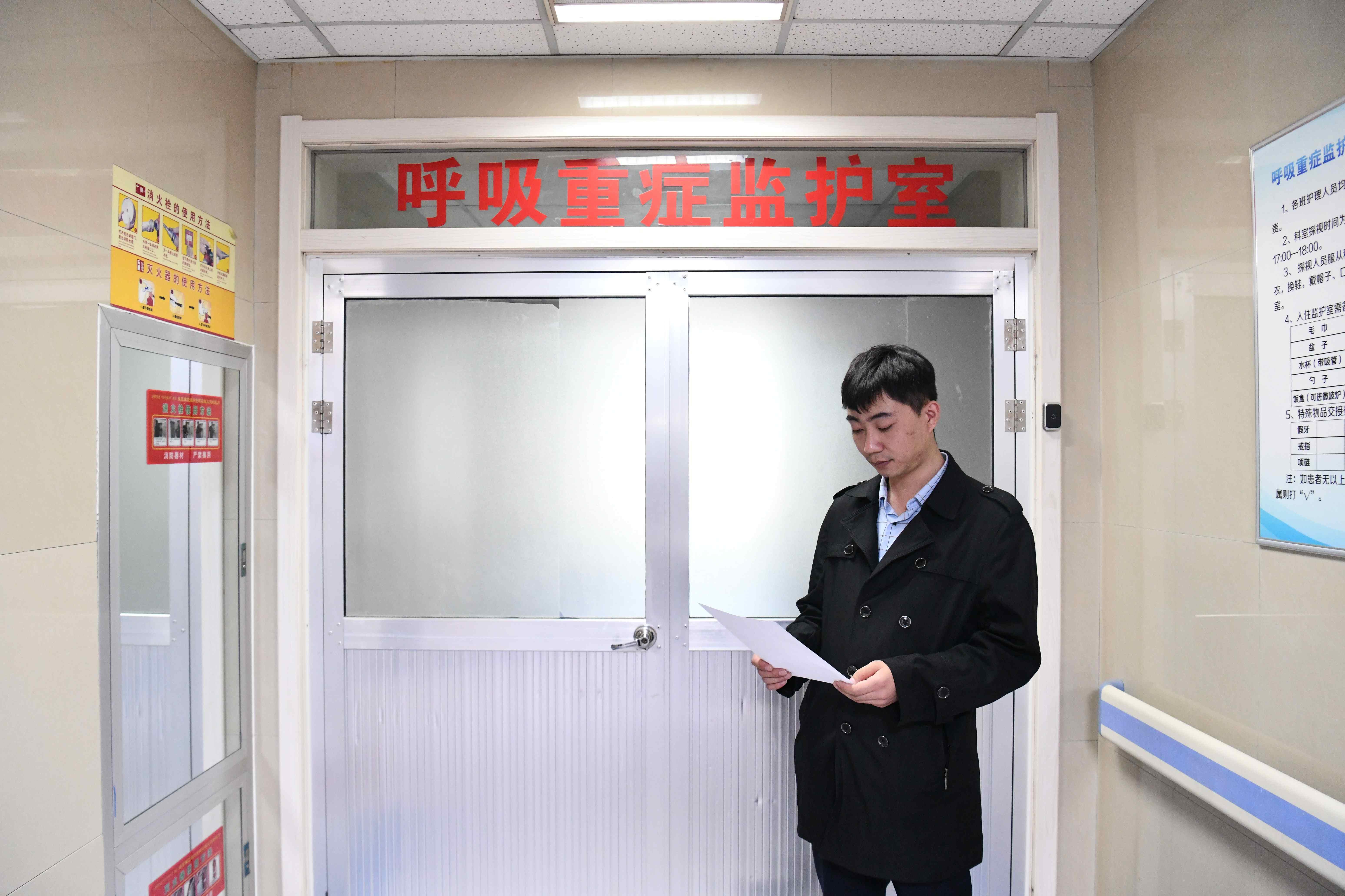 谢双义之子谢宗龙在呼吸重症监护室门前查看病历。