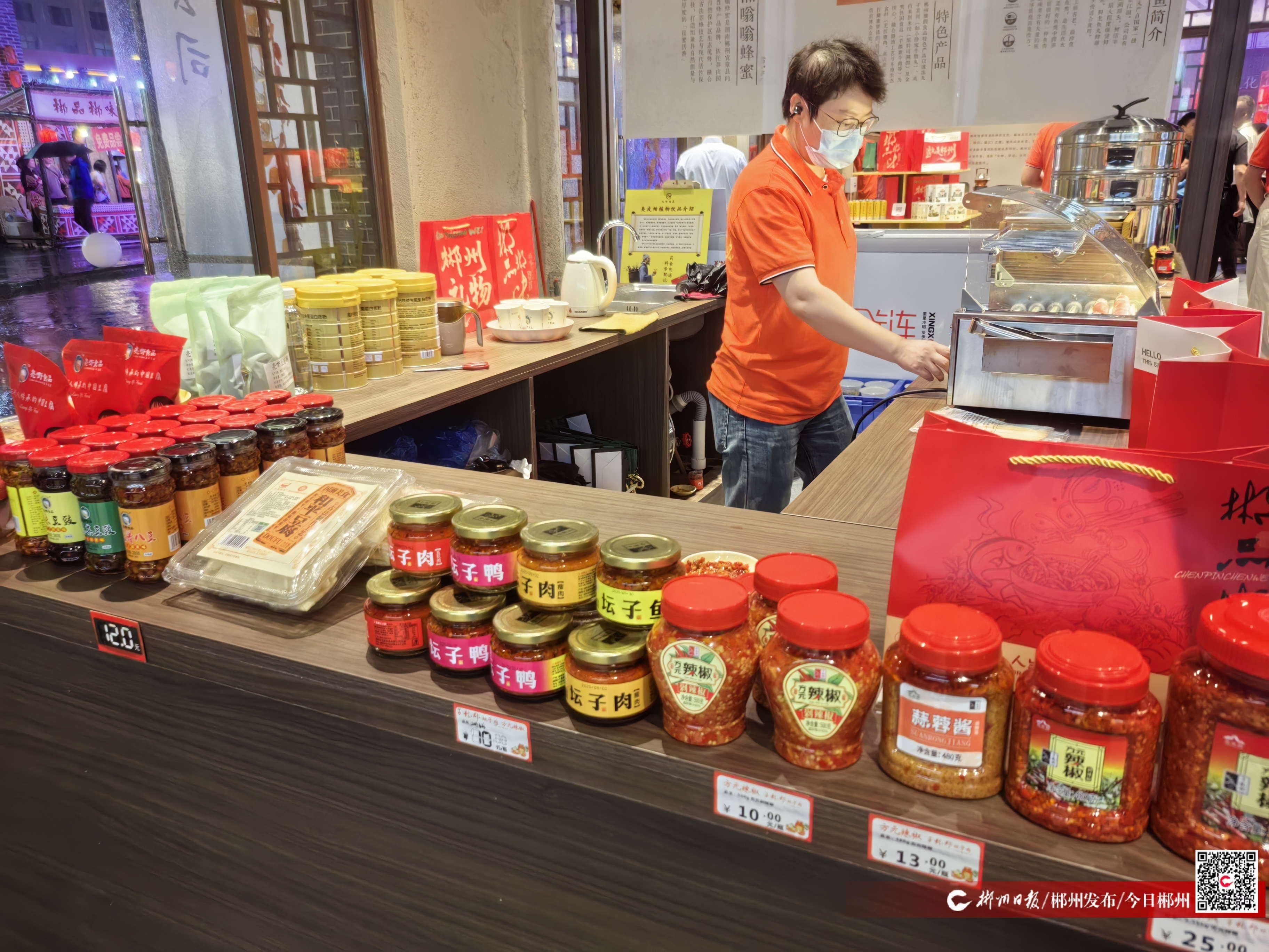 作为旅发大会的重要配套活动,“郴品郴味”展示展销活动在莽山瑶溪谷设置34家精选商户,涵盖郴州各县市区的优质农产品与非遗产品。展区不仅提供东江鱼、玲珑王茶叶、宜章灵芝等特色农产品,还展示鲁塘砂罐烧制技艺、桂阳剪纸、永兴手工切粉等非遗项目。游客可亲手体验桂阳剪纸、莽山茶艺,购买安仁富硒大米、嘉禾倒缸酒等健康产品。