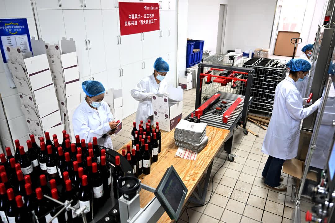 “双十一”订单纷至,永宁县闽宁镇立兰酒庄员工在加紧打包外销的葡萄酒。