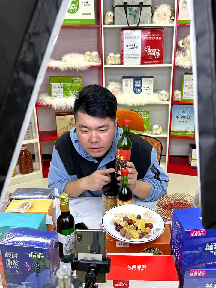 狮城宁好电商网批(西部)运营基地里,主播直播推广盐池滩羊、杂粮原浆等当地特产,借电商渠道拓宽当地特色产品销路。