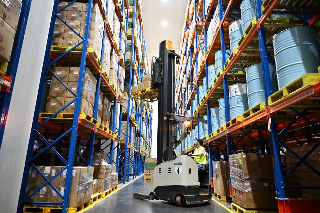 贺兰众力冷链仓储内工人操作叉车精准装卸,其“一区多温”高标准设施,保障宁夏及周边食品仓储配送,助力冷链商品高效供应。
