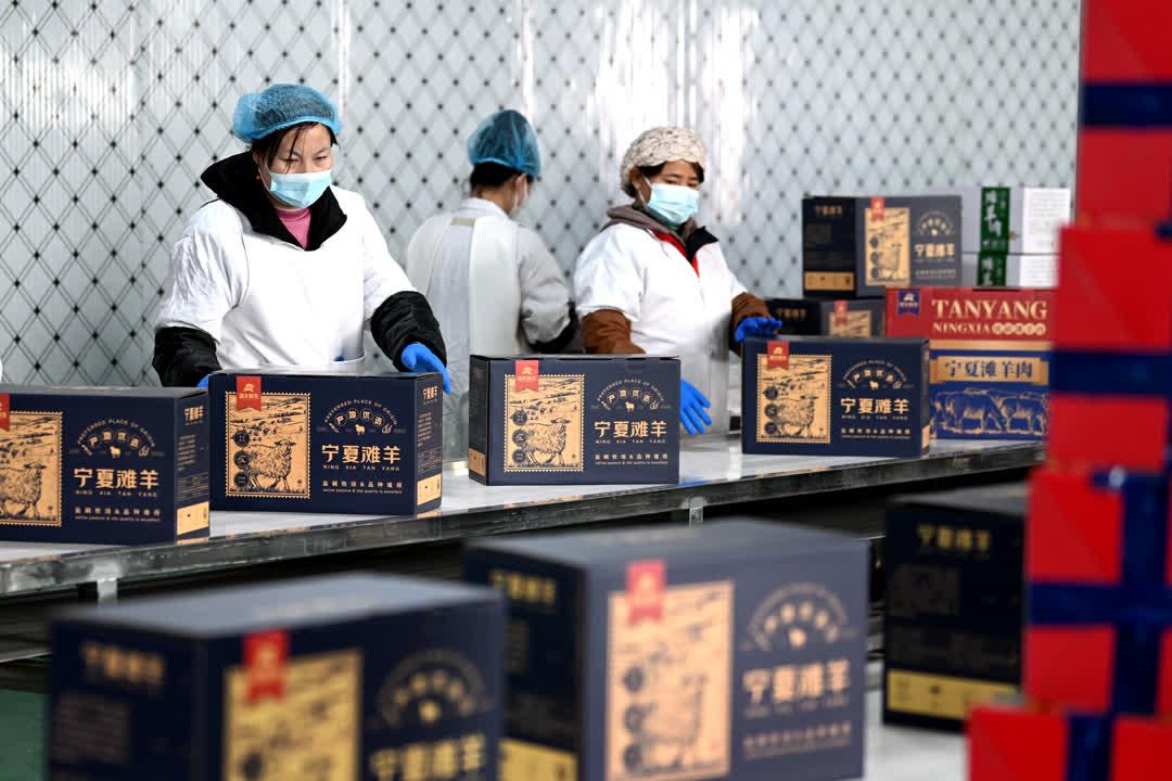 滩羊鲜生员工加紧包装宁夏滩羊礼盒备货,助力这一特色农产品俏销市场,保障线上订单供应。