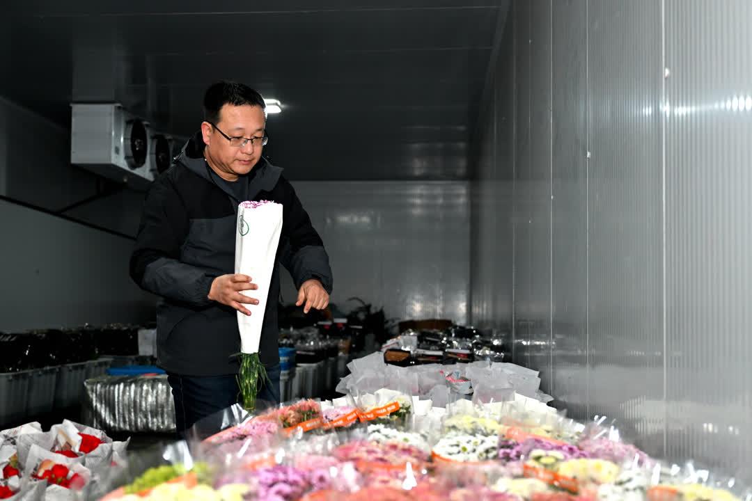 “双十一”期间,宁夏芊艺农业科技有限公司的花卉俏销全国。图为工作人员在冷库内精心整理花卉。