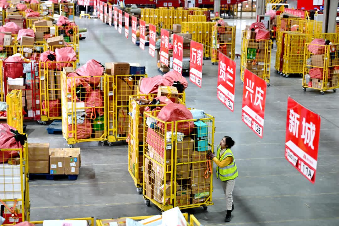 京东物流银川集散分拣中心里“兴庆”“贺兰”等区域标识清晰,“双十一”期间正高效分拣,全力保障区域内订单及时配送。