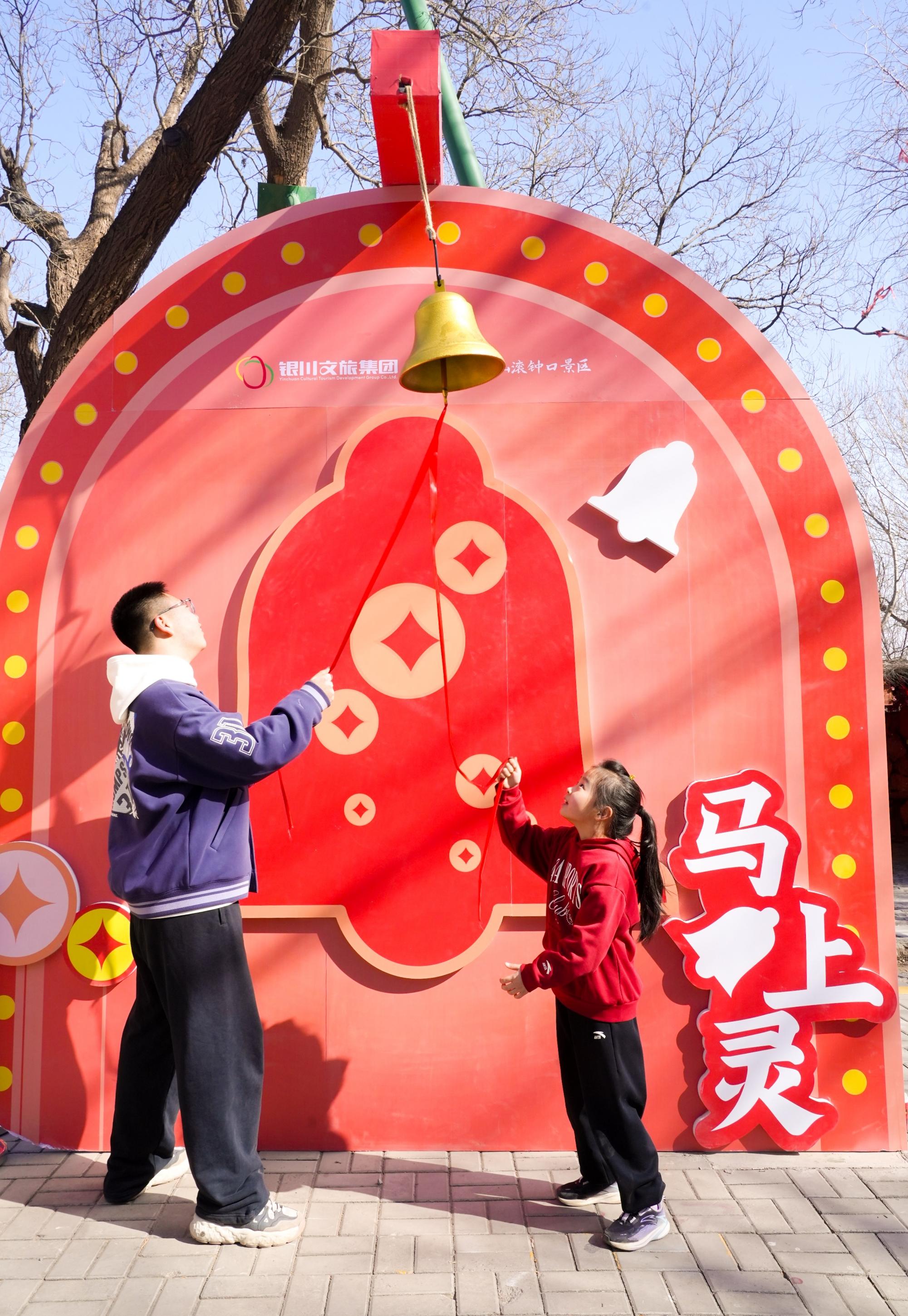 巨型“万福红包墙”前,银川市民吕美华凭门票揭下了一个红包,打开是一张写满祝福的卡片和一个吉祥挂件。“好彩头!”她开心地向家人展示。人群中,不时有“巡山小妖队长”随机出现,派发装有糖果和小铃铛的“福气袋”,制造不期而遇的惊喜。老君堂前,红绸缠绕的新年发财铃被游客依次敲响,寓意“一响百应,财运亨通”。