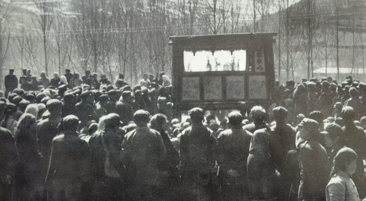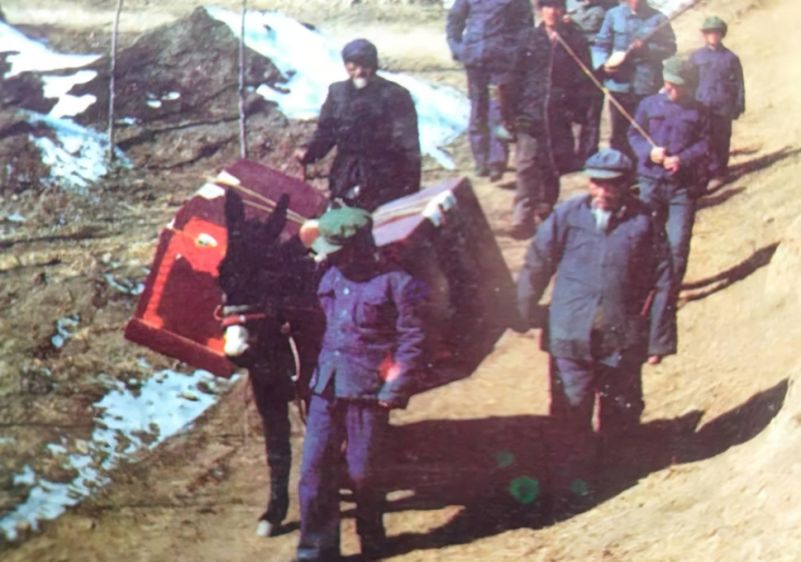 上世纪90年代,张永荣父亲的皮影戏班子翻山越岭赶场演出。受访者供图