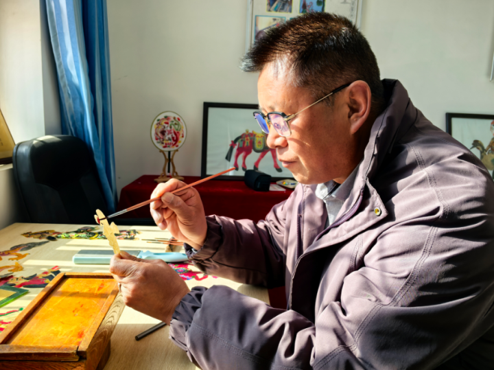 张永荣给皮影上色。西海新闻记者 张昕岳 摄