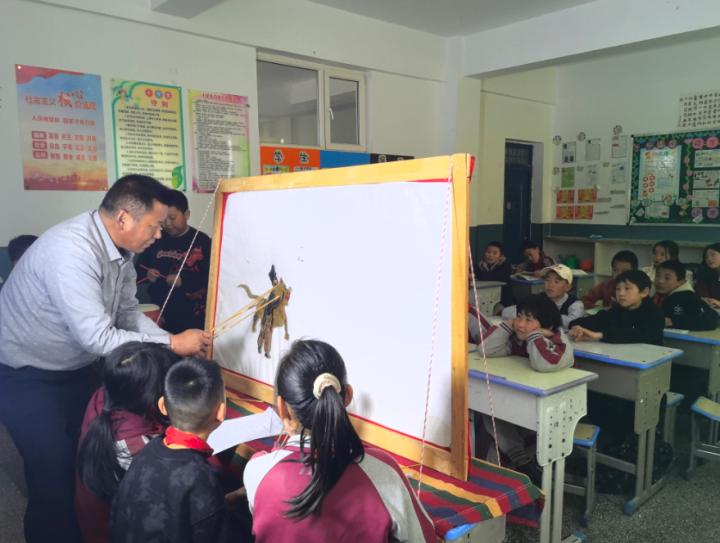 2017年,张永荣开始带着皮影走进校园。如今,西宁市五四小学、桃李小学、湟中区田家寨小学等多所学校,开设了他的皮影兴趣课堂。他特意把复杂的传统技艺简化,挑选生动经典的皮影片段,教孩子们简单的表演、伴奏和雕刻。“一上来就教复杂的,孩子们学不会也没耐心,得先让他们感受到皮影的乐趣、产生兴趣,再慢慢了解这门老手艺。”张永荣说。
